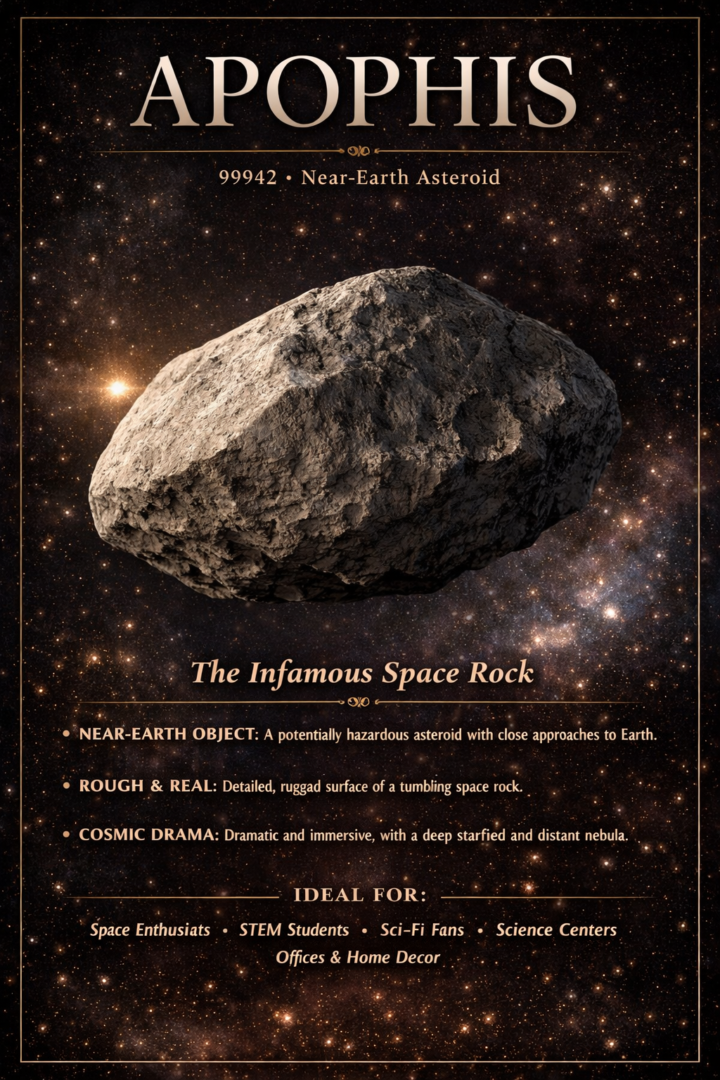 A dramatic portrait of 99942 Apophis—a famous near-Earth asteroid rendered with sharp, rugged texture and cinematic lighting. The dense starfield and warm glow create a bold, premium space print that instantly grabs attention.