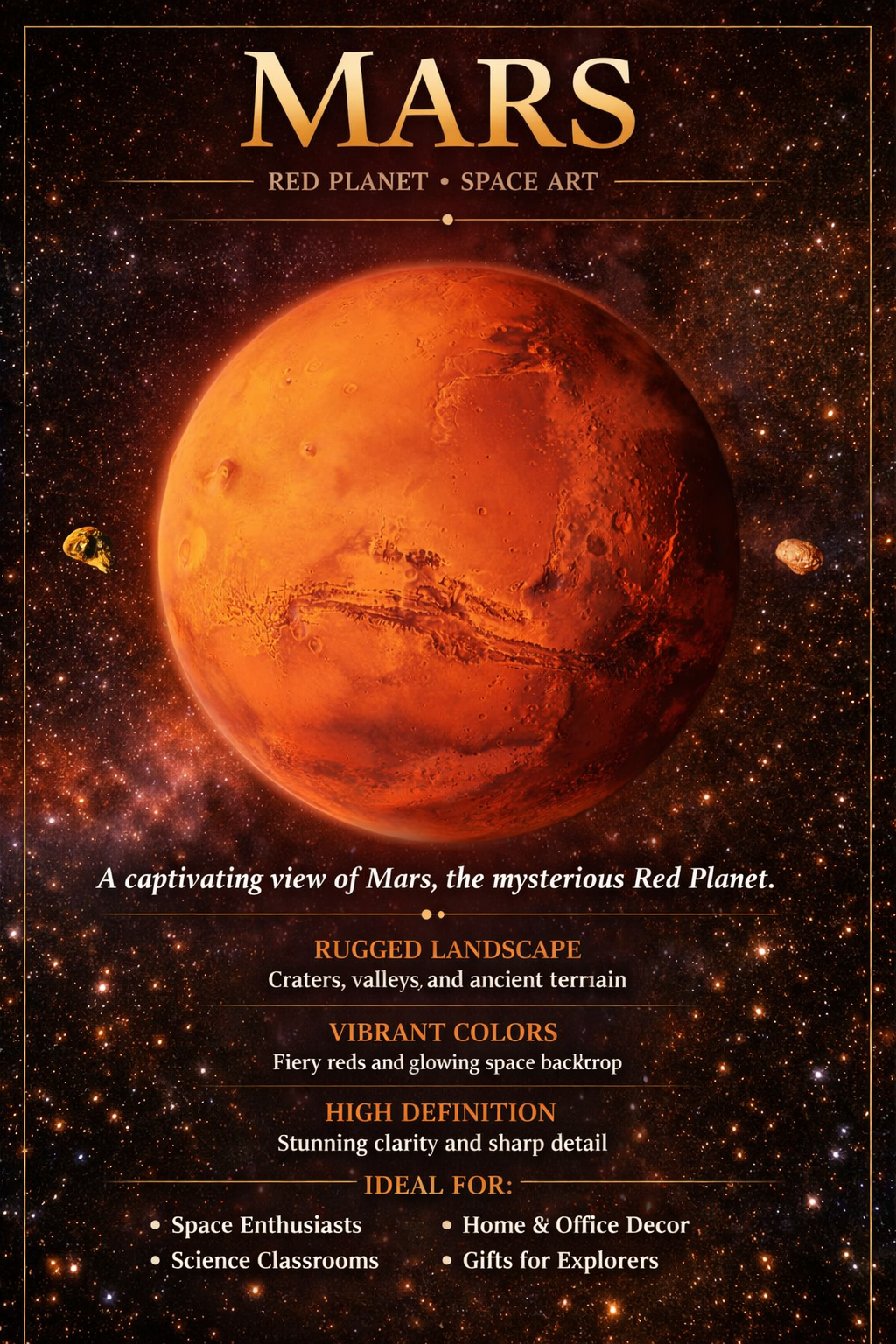 Bring the spirit of exploration into your space. Mars glows in rich red-orange tones, revealing rugged craters, ancient plains, and the dramatic scar of Valles Marineris—one of the most iconic landscapes in the solar system. With its two small moons nearby and a dense starfield behind it, this scene feels cinematic, bold, and undeniably adventurous.